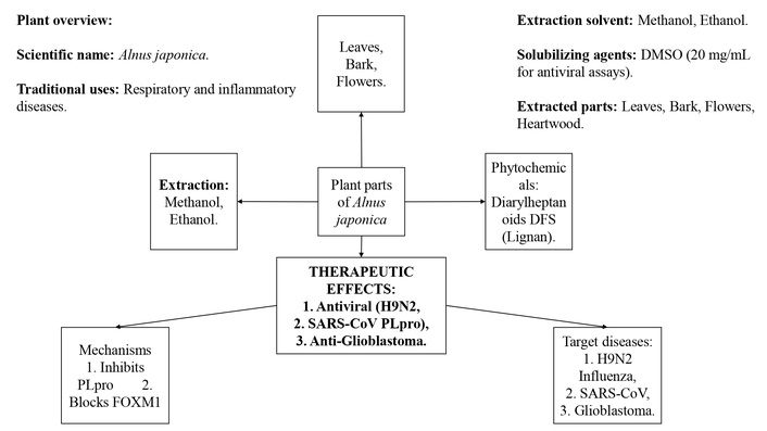 Collectively, the phytochemicals of A. japonica contribute diverse antiviral properties. Diarylheptanoids (hirsutenone, hirsutanonol, oregonin, platyphyllenone, platyphyllone, platyphyllonol-5-xylopyranoside, rubranol, rubranoside A, and rubranoside B) exhibit inhibitory activity against SARS-CoV PLpro, with hirsutenone being the most potent inhibitor [21]. Methanolic extracts of leaves, bark, and flowers act as strong suppressors of avian influenza virus replication, showing complete inhibition at specific concentrations without notable cytotoxicity [20]. Forkhead Box M1 (FOXM1), a transcription factor involved in cell growth, survival, and cancer development, is highly expressed in glioblastoma (GBM) compared to normal tissue. The therapeutic potential of a plant-derived lignan, (−)-(2R,3R)-1,4-O-diferuloylsecoisolariciresinol (DFS), isolated from A. japonica, in targeting GBM tumorspheres (TSs), which are known to contribute to tumor growth and resistance [22].