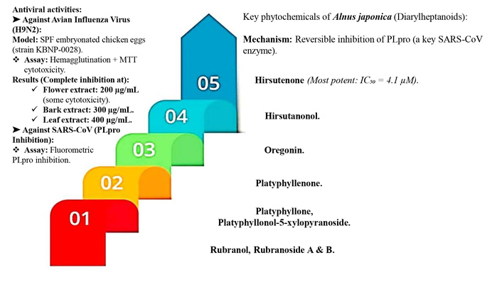 Beyond influenza, diarylheptanoids isolated from A. japonica have been evaluated for inhibitory effects against the papain-like protease (PLpro) of Severe Acute Respiratory Syndrome Coronavirus (SARS-CoV), a crucial enzyme in viral replication and a key antiviral drug target [21]. Through activity-guided fractionation of ethanol extracts, nine diarylheptanoids were purified and structurally characterized: hirsutenone, hirsutanonol, oregonin, platyphyllenone, platyphyllone, platyphyllonol-5-xylopyranoside, rubranol, rubranoside A, and rubranoside B [21]. Fluorometric assays confirmed that six of these compounds demonstrated clear dose-dependent suppression of PLpro activity, with reversible inhibition observed upon increasing enzyme concentrations. Among them, hirsutenone exhibited the strongest effect (IC50 = 4.1 µM), with structural analysis revealing that its catechol group and α, β-unsaturated carbonyl moiety were essential for potent inhibitory action [21].