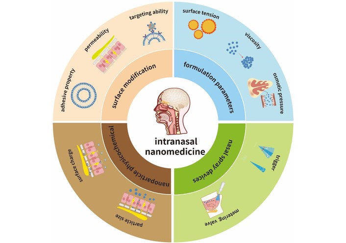 Intranasal nanomedicine utilizes the non-invasive nasal-to-brain delivery pathway, which bypasses the BBB via the olfactory nerve while capitalizing on the enhanced mucoadhesion and targeted delivery capabilities of nanocarriers. This perspective aims to summarize the four main aspects of intranasal nanomedicine design: (1) surface modification of nanoparticles to improve mucosal adhesion, facilitate epithelial penetration, and enable precise targeting; (2) optimization of formulation parameters to enhance drug absorption and minimize mucosal irritation; (3) rational design of nasal spray devices to ensure effective and reproducible deposition in the olfactory region; and (4) systematic investigation of nanoparticle physicochemical properties to modulate biodistribution, promote cellular uptake, and increase bioavailability (Figure 2). These four intranasal nanomedicine design approaches offer a strategic framework for the design and clinical translation of next-generation intranasal nanomedicines.