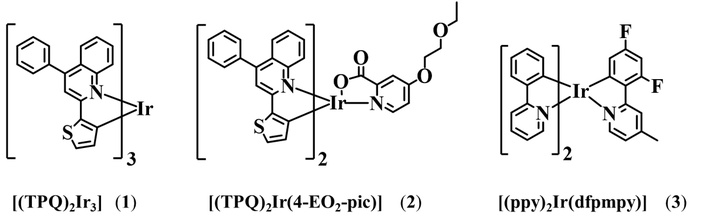 The 1H NMR (in CDCl3) for the complexes (1–3) has exhibited the chemical shifts depending on electron densities around the protons. The 13C{1H} resonances were exhibited for aryl as well as for aliphatic protons in the case of [(TPQ)2Ir(4-EO2-pic)] (2) and [(ppy)2Ir(dfpmpy)] (3) complexes.