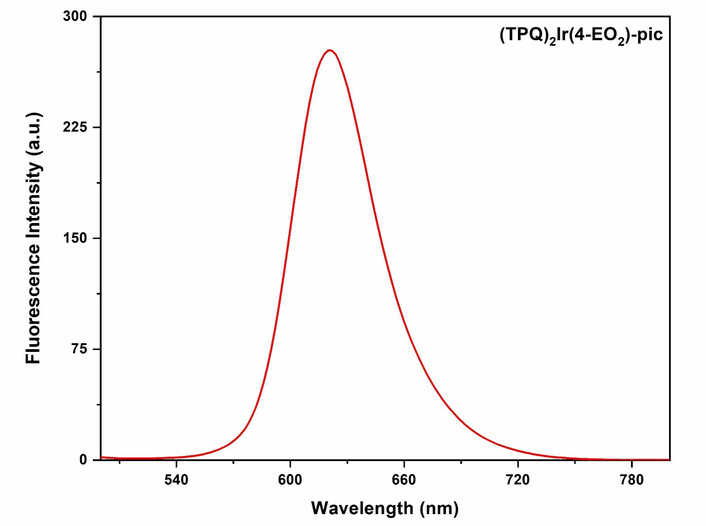 The two absorbance bands observed at wavelengths (λ) 312 nm and 421 nm are attributable to π-π* transitions of the ligands, and a shoulder at 459 nm is attributable to MLCT (metal-to-ligand charge transfer) transitions. A weaker band seen at λ 578 nm is attributable to a spin-forbidden MLCT transition. The PL spectrum of [(TPQ)3Ir] (1) complex is presented in. The PL spectrum of [(TPQ)3Ir] (1) complex exhibits a red emission peak at 601 nm upon excitation with λ 430 nm, owing to the donor-acceptor system in the cyclometallated ligand. The UV-Vis absorption and emission (PL) spectra of [Ir(TPQ)2(4-EO2-pic)] (2) complex were recorded at ambient temperature in acetonitrile. The strong absorptions in the UV region at λ ranging from 280 to 370 nm are attributable to spin-allowed π-π* transitions of the phenyl quinoline moiety of ligands. The weak bands in the visible range of wavelength λ 406–576 nm are attributable to the mixed singlet and triplet MLCT and intra-ligand CT transitions. The complex [(TPQ)2Ir(4-EO2-pic)] (2) exhibited a single broad red emission centered at wavelength ~625 nm upon excitation by 583, 554, and 443 nm wavelengths (Figure 2).