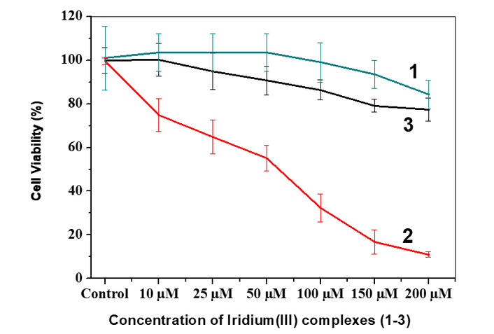 The [(TPQ)2Ir(4-EO2-pic)] (2) complex was found to be cytotoxic with substantially higher efficiency (IC50 = 60 µM) as compared to [(TPQ)3Ir] (1) and [(ppy)2Ir(dfpmpy)] (3) complexes, which have been depicted in Figure 3. Among the three Ir(III) complexes, the [(TPQ)2Ir(4-EO2-pic)] (2) complex has exhibited better anticancer activity. The structural features of [(TPQ)2Ir(4-EO2-pic)] (2) complex with a polar organic side chain conferring a better amphiphilic nature lead to its better chances for internalization in cancer cells and eventually better anticancer potency.