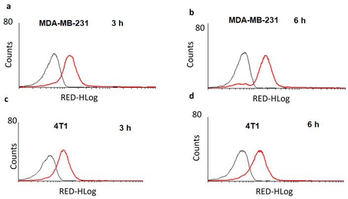 Cellular internalization of [Ir(TPQ)2(4-EO2-pic)] (2) complex by flow cytometry in triple-negative breast cancer cells MDA-MB-231 at 3 h (a), MDA-MB-231 at 6 h (b), 4T1 at 3 h (c), and 4T1 at 6 h (d) (Counts is no. of cells & RED-HLog is the fluorescence emitted by the compound internalized in the cells).