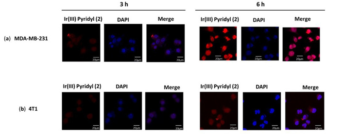 The cellular internalization of [Ir(TPQ)2(4-EO2-pic)] (2) complex was also evaluated by cellular imaging using the red emissive property of this test complex. The MDA-MB-231 and 4T1 mammary carcinoma cell lines were treated with the [(TPQ)2Ir(4-EO2-pic)] (2) complex and its real time internalization was monitored by confocal microscopy at 3 h and 6 h which revealed that, the cellular uptake increased with time and at the end of 6 h the complex [(TPQ)2Ir(4-EO2-pic)] (2) complex has much higher internalization in TNBC MDA-MB-231 cancer cells as compared to 4T1 mammary carcinoma cells (Figure 5) which is in good agreement with flow cytometry results as discussed earlier.