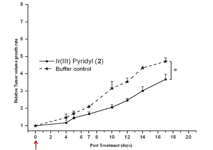 From the data of tumor volumes calculated, the relative tumor growth rate was plotted against the number of days post-treatment in response to treatment of [(TPQ)2Ir(4-EO2-pic)] (2) complex and a control group as well.