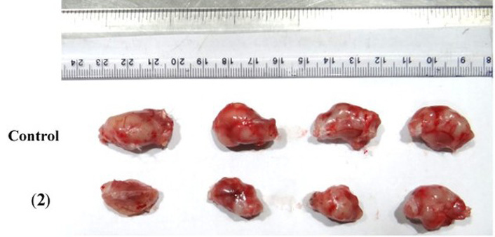 The study of treatment of [(TPQ)2Ir(4-EO2-pic)] (2) complex (10 mg/kg) was performed to evaluate the inhibition of the growth of the tumor as compared to a PBS buffer control until the size of the tumor in mice, which were administered with buffer control, grew to ~1,500 mm3. Later, the mice were sacrificed via saturated CO2 euthanasia. Then, the tumors were extracted via surgery. The tumor images in response to treatments with [(TPQ)2Ir(4-EO2-pic)] (2) complex (10 mg/kg) in comparison with a control of PBS buffer are shown in Figure 7.