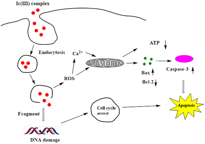 General mechanism of cancer cell killing by Ir(III) complexes. ROS: reactive oxygen species.