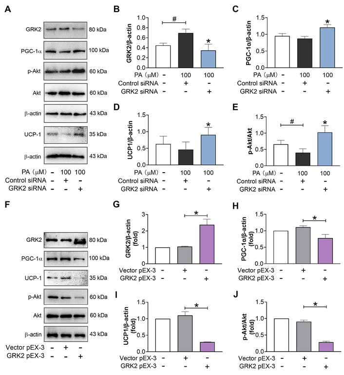 In the preliminary experiment, we have demonstrated that the classic cocktails can induce the differentiation of 3T3-L1 cells successfully, as evidenced by oil red staining (Figure S1). Under this premise, we first explored whether GRK2 suppressed the expression of marker proteins of brown and/or brite adipocytes in differentiated 3T3-L1 cells. The protein abundance analysis showed that GRK2 silencing lowered the protein level of GRK2 and enhanced that of PGC-1α, UCP-1, and Akt phosphorylation at residue S473 under PA treatment (Figure 1A–E), even though PA attenuated the protein levels of PGC-1α and UCP-1 slightly. In contrast, GRK2 overexpression exhibited a contrary effect on the protein expression (Figure 1F–J). This result, coupled with other effects of GRK2 found in obesity, insulin resistance, and adipose tissue browning by other researchers, indicates that GRK2 might serve as a potent regulatory target for adipocyte browning or whitening.