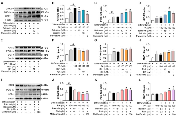 Baicalin, Rb1, and their metabolites downregulate GRK2 expression and improve the browning of 3T3-L1 cells under PA treatment. Cells were exposed to PA and different compounds during the whole period of differentiation. (A–D): Effects of baicalin and baicalein (n = 3). (E–H): Effects of Rb1 and CK (n = 3). (I–L): Effect of baicalin-Rb1 combination (n = 5). #: P < 0.05 compared between two indicated groups; *: P < 0.05 compared with model (differentiation-PA). GRK2: G protein-coupled receptor kinase 2; PGC-1α: peroxisome proliferator-activated receptor-gamma coactivator 1 α; UCP-1: uncoupling protein-1; PA: palmitic acid; CK: compound K.