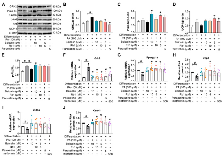 Baicalin, Rb1, and their combination facilitate the browning trend during 3T3-L1 cell differentiation under PA-loading conditions. (A–E): The protein expressions (n = 5). (F–J): The gene expressions (n = 5). #: P < 0.05 compared with differentiation-blank; *: P < 0.05 compared with model (differentiation-PA). GRK2: G protein-coupled receptor kinase 2; PGC-1α: peroxisome proliferator-activated receptor-gamma coactivator 1 α; UCP-1: uncoupling protein-1; PA: palmitic acid.