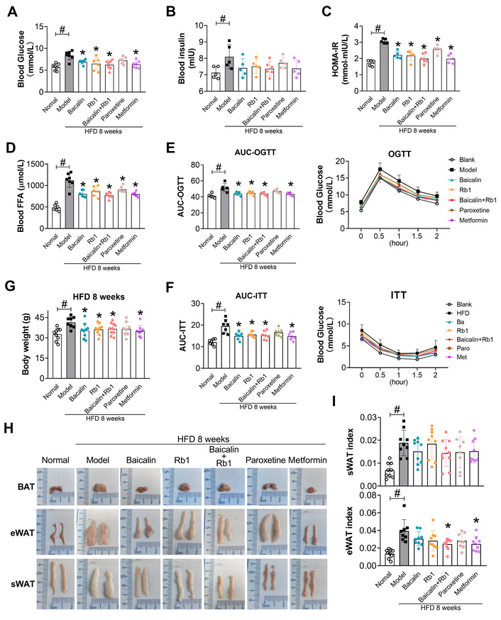 Then, the effects of these drugs were explored in vivo. Baicalin, Rb1, and combined treatment ameliorated the HFD-induced metabolic disorders, as evidenced by decreased body weight, blood glucose, insulin, homeostatic model assessment of insulin resistance (HOMA-IR), FFA, and improved blood glucose in OGTT and ITT (Figure 4A–G). In addition, compared with the subcutaneous WAT (sWAT) and BAT from model mice, which turned white in comparison to the normal group, those from the mice receiving treatments showed a more brown color (Figure 4H). These compounds also decreased the adiposity indexes of epididymal WAT (eWAT) and sWAT (Figure 4I). The combined treatment showed a more significant effect, which was similar to that of metformin and paroxetine (Figure 4I). We did not evaluate the BAT index, because the loss and whitening of BAT make it difficult to work out the exact weight of BAT. These data indicate that baicalin and Rb1 can prevent HFD-induced whitening of inguinal WAT and interscapular BAT.