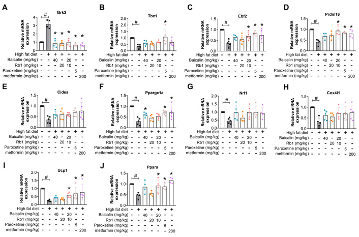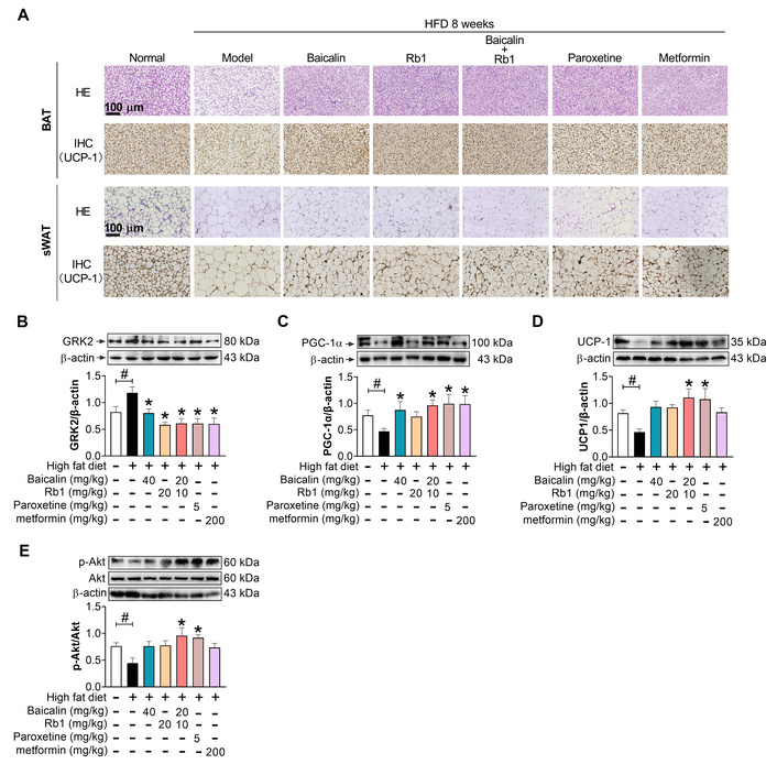 Conclusions: Baicalin and Rb1, alone or in combination, improved the browning of adipocytes during differentiation and prevented the whitening shift of WAT on an HFD, which was associated with the downregulation of GRK2. The study expands the understanding of the anti-obesity effects of baicalin and Rb1 and the potential of Scutellariae Radix-Ginseng Radix et Rhizoma compatibility for treating obesity-associated metabolic diseases.