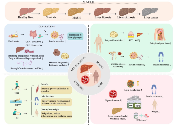 Discussion: GLP-1RAs, SGLT-2 inhibitors, DPP-4 inhibitors, exercise, and Chinese Herbal Medicines benefited liver health, glycemic control in T2DM with MAFLD, and impacted body composition and lipid metabolism.