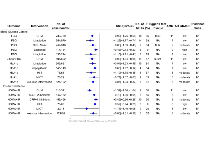 Forest plot of clinical management strategies significantly improving endocrine and metabolic indicators in patients with T2DM complicated with MAFLD. CHM: Chinese Herbal Medicine; HOMA-IR: homeostasis model assessment of insulin resistance; FBG: fasting blood glucose; DPP-4: dipeptidyl peptidase-4; SGLT-2: sodium-glucose cotransporter 2; GLP-1RAs: glucagon-like peptide-1 receptor agonists; PBG: postprandial blood glucose; HbA1c: glycated hemoglobin A1c; HIIT: high-intensity interval training; MICT: moderate-intensity continuous training; AMSTAR: A Measure Tool to Assess Systematic Reviews; CI: confidence interval; NA: not available; RCTs: randomized controlled trials; GRADE: Grading of Recommendations, Assessment, Development, and Evaluations; SMD: standardized mean differences; T2DM: type 2 diabetes mellitus; MAFLD: metabolic dysfunction-associated fatty liver disease.