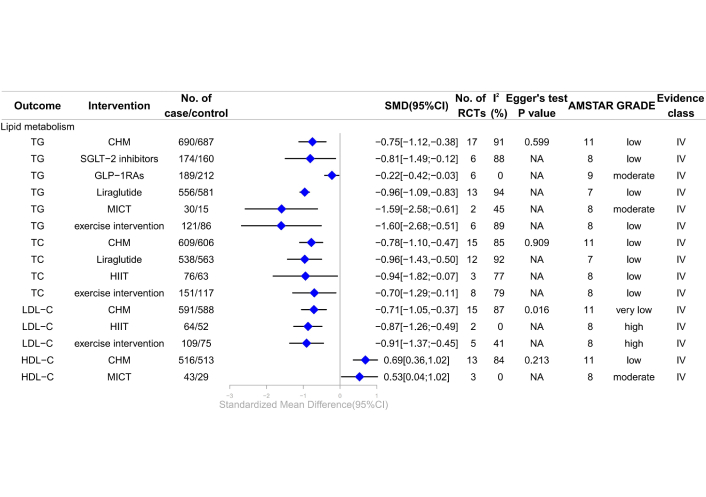 Forest plot of clinical management strategies significantly improving lipid metabolism indicators in patients with T2DM complicated with MAFLD. TG: triglyceride; TC: total cholesterol; LDL-C: low-density lipoprotein cholesterol; HDL-C: high-density lipoprotein cholesterol; CHM: Chinese Herbal Medicine; HIIT: high-intensity interval training; MICT: moderate-intensity continuous training; SGLT-2: sodium-glucose cotransporter 2; GLP-1RAs: glucagon-like peptide-1 receptor agonists; AMSTAR: A Measure Tool to Assess Systematic Reviews; CI: confidence interval; NA: not available; RCTs: randomized controlled trials; GRADE: Grading of Recommendations, Assessment, Development, and Evaluations; SMD: standardized mean differences; T2DM: type 2 diabetes mellitus; MAFLD: metabolic dysfunction-associated fatty liver disease.