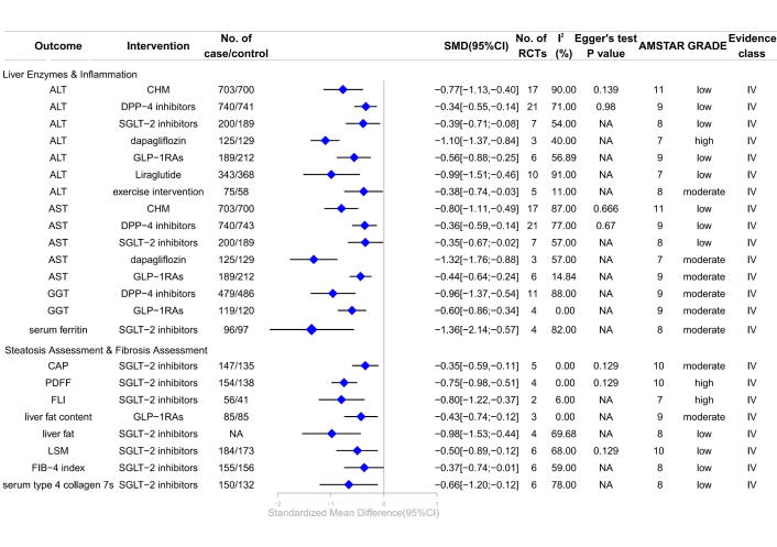Forest plot of clinical management strategies significantly improving hepatic health indicators in patients with T2DM complicated with MAFLD. CHM: Chinese Herbal Medicine; DPP-4: dipeptidyl peptidase-4; SGLT-2: sodium-glucose cotransporter 2; GLP-1RAs: glucagon-like peptide-1 receptor agonists; ALT: alanine aminotransferase; AST: aspartate aminotransferase; GGT: gamma-glutamyl transferase; LSM: liver stiffness measurement; FLI: liver fat index; PDFF: proton density fat fraction; CAP: controlled attenuation parameter; FIB-4: fibrosis 4; AMSTAR: A Measure Tool to Assess Systematic Reviews; CI: confidence interval; NA: not available; RCTs: randomized controlled trials; GRADE: Grading of Recommendations, Assessment, Development, and Evaluations; SMD: standardized mean differences; T2DM: type 2 diabetes mellitus; MAFLD: metabolic dysfunction-associated fatty liver disease.