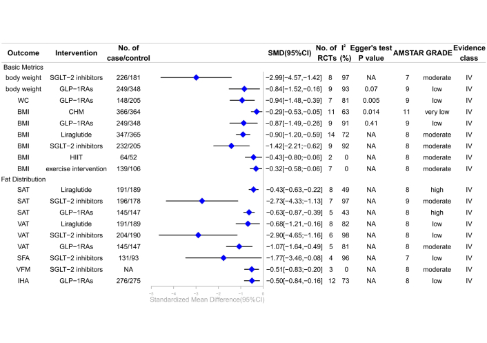 Forest plot of clinical management strategies significantly improving body composition indicators in patients with type 2 diabetes mellitus complicated with non-alcoholic fatty liver disease. CHM: Chinese Herbal Medicine; HIIT: high-intensity interval training; SGLT-2: sodium-glucose cotransporter 2; GLP-1RAs: glucagon-like peptide-1 receptor agonists; BMI: body mass index; WC: waist circumference; IHA: intrahepatic adipose; VFM: visceral fat mass; VAT: visceral adipose tissue; SAT: subcutaneous adipose tissue; SFA: subcutaneous fat areas; AMSTAR: A Measure Tool to Assess Systematic Reviews; CI: confidence interval; NA: not available; RCTs: randomized controlled trials; GRADE: Grading of Recommendations, Assessment, Development, and Evaluations; SMD: standardized mean differences.