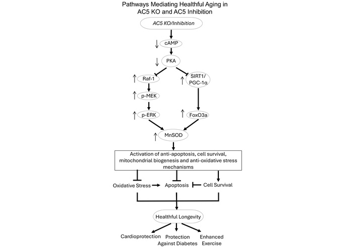 Pathways mediating healthful aging in AC5 KO and AC5 inhibition. The mechanisms mediating the healthful longevity, enhanced exercise performance, cardioprotection, and protection against diabetes in the AC5 KO mice and the AC5 pharmacological inhibitor are shown. Deletion or inhibition of AC5 reduces intracellular cAMP production, which leads to less activation of protein kinase PKA. The reduced activity of PKA leads to increased activity of Raf-1/MEK/ERK and SIRT1/PGC-1α/FoxO3a, ultimately increasing MnSOD, inducing healthful longevity with activation of anti-apoptosis, cell survival, mitochondrial biogenesis, and anti-oxidative stress. AC5 KO: adenylyl cyclase 5 knockout; PKA: protein kinase A; SIRT1: sirtuin 1; PGC-1α: peroxisome proliferator-activated receptor gamma coactivator 1-alpha; FoxO3a: forkhead box O3.