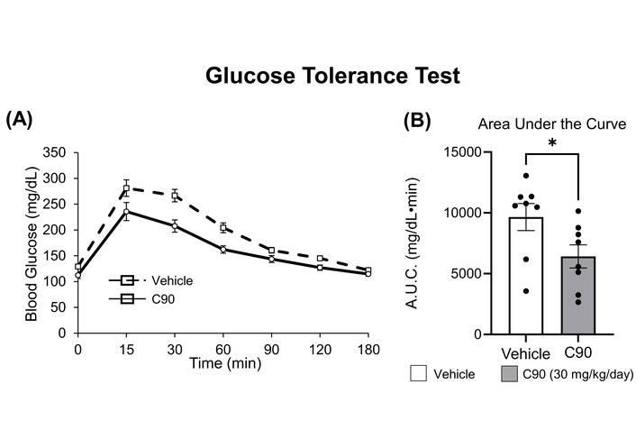 C90 improves glucose tolerance in wild-type (WT) C57BL/6 mice. 3–5-month-old male C57BL/6 were chronically treated with C90 at 30 mg/kg/day via osmotic pumps for 14 days. The glucose tolerance test was examined after 2 weeks of treatment. Compared to the vehicle group, WT mice that received C90 display improved glucose tolerance, as shown in the curve (A) and area under the curve (B). *p < 0.05, by Student’s unpaired t-test. n = 8 in each group.