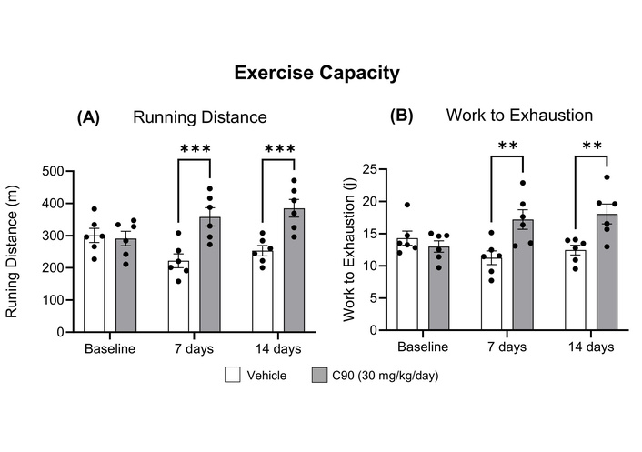 C90 enhances exercise capacity in wild-type (WT) C57BL/6 mice. 3–5-month-old male C57BL/6 were chronically treated with C90 at 30 mg/kg/day via osmotic pumps for 14 days. Maximal exercise capacity was tested at baseline and after 1 and 2 weeks of treatment. WT mice that received C90 showed longer running distance (A) and greater work to exhaustion (B), when compared to the vehicle group, after 1 and 2 weeks of C90 treatment. **p < 0.01, ***p < 0.001 by two-way ANOVA with Sidak’s multiple comparisons test. n = 6 in each group.