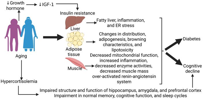 Aging associated insulin resistance and diabetes. Insulin resistance with aging due to multiple contributors results in development of diabetes and altered metabolism may result in cognitive decline. IGF-1: insulin-like growth factor-1. Created in BioRender. Rai, V. (2025) https://BioRender.com/35e29u1