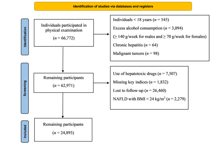 Exclusion criteria: (1) excessive alcohol consumption: ≥ 140 g/week for males and ≥ 70g/week for females; (2) self-reported viral hepatitis, history of cancer, or autoimmune diseases; (3) long-term medication use; (4) lack of important indicators such as BMI, height, and weight data; (5) lack of follow-up; (6) individuals who developed NAFLD during follow-up but whose BMI remained < 24 kg/m2 throughout the study period were excluded, in order to avoid potential bias from lean NAFLD trajectories that may involve distinct etiological mechanisms unrelated to metabolic factors. The study inclusion flow chart is shown in Figure 1 [27].