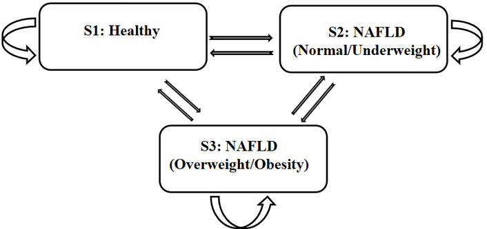 Structure of the multi-state Markov model showing transitions between healthy state (S1), NAFLD with BMI < 24 kg/m2 (S2), and NAFLD with BMI ≥ 24 kg/m2 (S3). NAFLD: non-alcoholic fatty liver disease; BMI: body mass index.