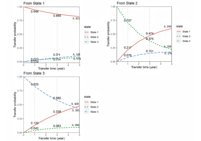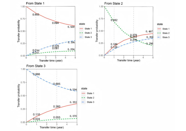 This study employed a multi-state Markov model to predict the transition probabilities between S1, S2, and S3, focusing on the transition trends over 1, 3, and 5 years. The results showed that in the male population, the probabilities of transitioning from S1 to S2 were 4.1%, 8.1%, and 9.4% at 1, 3, and 5 years, respectively, showing a gradual increase. The probabilities of transitioning from S1 to S3 were 9.4%, 22.5%, and 30.6%, also increasing over time. Similarly, the probabilities of transitioning from S2 to S3 were 12.9%, 27.8%, and 35.0%, showing a consistent upward trend. As shown in Figure 3.