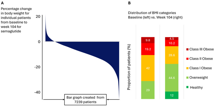 Individual and by BMI category weight loss in the SELECT trial. A replica of a waterfall (panel A) showing individual percentage change in body weight from the baseline and stacked (‘temperature’; panel B) bar graphs showing changes in weight categories in the study population between baseline and week 104 of treatment with semaglutide; here, the category ‘healthy’ was defined as BMI < 25 kg/m2. Adapted from [9]. © The Author(s) 2024. Licensed under a CC-BY 4.0.
