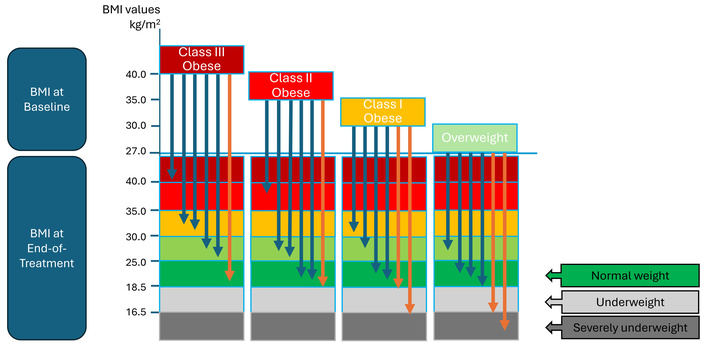Although the published waterfall graphs allow for discerning the magnitude of individual weight loss, they do not indicate the individual BMIs achieved at the end of treatment, i.e., whether it is still in the obese range, has reached a normal/healthy BMI, or has fallen into an underweight category. This can be presented as a ‘temperature’ graph akin to one commonly used to report time ranges for CGM values. A nice attempt to present BMI data this way was shown in one of the publications from the SELECT trial [9] and, more recently, in the supplementary materials accompanying the published results from the REDEFINE-1 trial [3]. In SELECT, the average weight loss achieved in the semaglutide 2.4 mg arm was 10.2%. Even with such moderate average weight loss, as shown in Figure 1, there was a profound shift in BMI categories, with more patients ending up in the overweight category and some emerging with BMI categorized as healthy. The graph would have been complete if the percentage of patients in the underweight BMI range had been added (even if it is zero) as a separate category and color-coded accordingly. This is important because 12% reaching a BMI of less than 25 kg/m2 out of over seven thousand is a large number [9]. In REDEFINE-1, six participants were reported to have reached the underweight category [3] during the study, despite active precautions to avoid crossing the lower boundary of the normal BMI range. The limitation of showing shifts in BMI categories is that they do not adequately inform about the magnitude of the actual BMI decline. For example, a shift from the overweight (defined at baseline as BMI 27–29.9 kg/m2) to the normal BMI category (BMI 18.5–24.9 kg/m2) could indicate a drop anywhere from 2.1 to 11.4 kg/m2.
