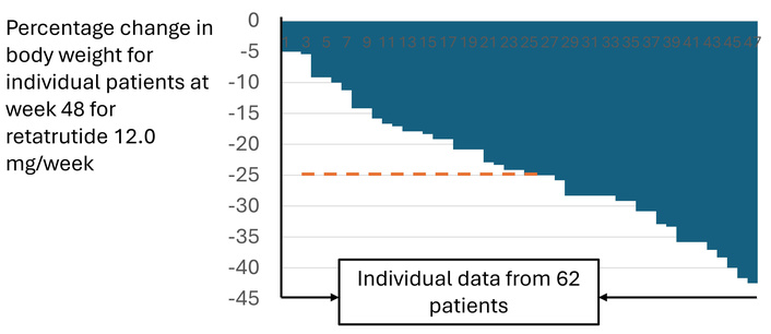 A waterfall graph from the phase 2 trial with retatrutide showing the individual percentage of the weight loss at week 48 of treatment at the target dose of 12 mg per week. Adapted with permission from [4] supplementary materials. © 2023 Massachusetts Medical Society.