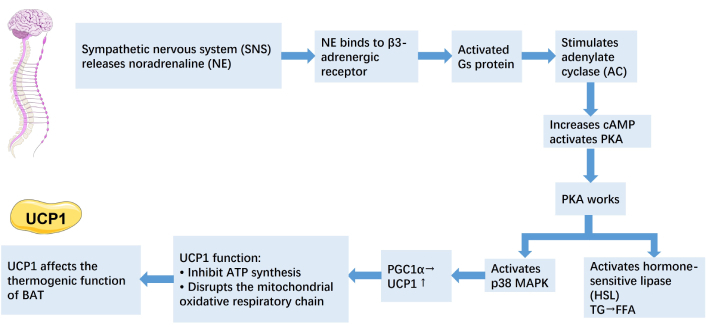 Mechanism of thermogenesis in BAT. The icon is provided by Servier Medical Art (https://smart.servier.com), licensed under CC BY 4.0 (https://creativecommons.org/licenses/by/4.0/). cAMP: cyclic adenosine monophosphate; PKA: protein kinase A; MAPK: mitogen-activated protein kinase; PGC1α: peroxisome proliferator-activated receptor gamma coactivator-1 alpha; UCP1: uncoupling protein 1; ATP: adenosine triphosphate; BAT: brown adipose tissue.