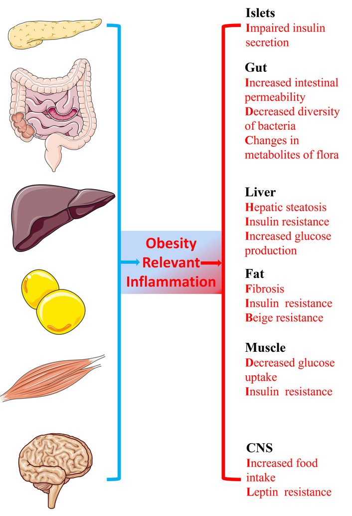In the last half-century, the prevalence of obesity and type 2 diabetes mellitus (T2DM) has been rapidly increasing on a global scale and has now reached epidemic proportions [1–4]. Obesity is the crucial cause of insulin resistance and a driver of the global epidemic of type 2 diabetes [5]. As a well-recognized underlying abnormality, insulin resistance stems from an imbalance between energy intake and expenditure—one that favors the pathways of nutrient storage. These pathways evolved to promote energy conservation (rather than utilization) during periods of scarcity, but in the modern context of excess energy, they exacerbate the development of obesity [6]. At the outset of the energy imbalance, lesions of white adipose tissue and circulating metabolites modulate tissue communication and insulin signaling [7, 8]. When it sinks into persistent state, obesity-related chronic inflammation accelerates these abnormalities [9]. Obesity-induced chronic tissue inflammation underlines the predominant role of dysmetabolism under these circumstances [9, 10]. Chronic tissue inflammation exerts a series of effects on adipose tissue, muscle, liver, pancreatic islets, the gut, and hypothalamus [5]. These inflammatory shifts conduce to insulin resistance (fat, muscle, liver) [11, 12], reduced insulin secretion (islets) [13], gut microbial dysbiosis and increased intestinal permeability (gut) [14], and increased food intake (hypothalamus) [15].