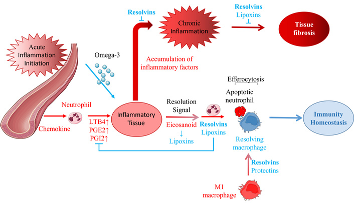 SPMs play crucial roles in the vascular response and neutrophil trafficking, from acute inflammation initiation to resolution or continuation. The SPMs, lipoxins, resolvins, protectins, and maresins are produced during this self-limited process. When acute inflammation occurs in local tissues, a large number of chemokines (PGE2, PGI2 (vasodilation), and LTB4 (chemotaxis and adhesion) are released to make the neutrophils chemotactic to the tissue. As one of the initiating parts of resolution, eicosanoids are converted to lipoxins, signaling and beginning the end of the acute inflammatory response [74, 77, 78]. Lipoxins and resolvins limit the infiltration of polynuclear neutrophils and promote their apoptosis. Resolving macrophages induced by resolvins and protectins then clear the apoptotic neutrophils in a process known as efferocytosis, which restores the immunity homeostasis of the inflammatory tissue. Resolution failure leads to the continued accumulation of various inflammatory factors, the development of chronic inflammation (which can be suppressed by resolvins), and fibrosis (which can be inhibited by resolvins and lipoxins). Figure 2 shows that resolvins play a key role in different resolution processes for acute and chronic inflammation, suggesting that they may be the most potent of the SPMs.