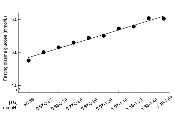 However, the association between triglyceride levels and T2DM prevalence has not previously been examined in individuals with normal triglyceride concentrations (< 1.7 mmol/L) in cross-sectional studies. Additionally, it remains unclear whether triglyceride levels within the normal range are associated with plasma glucose levels. This study aimed to address these knowledge gaps by examining the associations between triglyceride levels and fasting plasma glucose, and between triglyceride levels and T2DM, in a cohort of 16,706 Chinese adults with triglycerides in the normal range. We hypothesized that higher-normal triglyceride levels were positively associated with plasma glucose and T2DM risk after controlling for metabolic confounders.