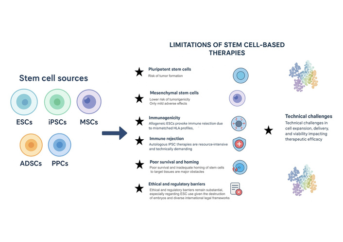 Sources of stem cells and major limitations of stem cell-based therapies. Overview of commonly used stem cell types—including embryonic stem cells (ESCs), induced pluripotent stem cells (iPSCs), mesenchymal stem cells (MSCs), adipose-derived stem cells (ADSCs), and perinatal progenitor cells (PPCs)—and key challenges limiting their translational application. Major barriers include tumorigenicity in pluripotent cell derivatives, immunogenicity due to mismatched HLA profiles, immune rejection in autologous and allogeneic settings, inadequate survival and homing after transplantation, technical difficulties in large-scale expansion and delivery, and ethical or regulatory concerns, particularly regarding ESC use. This figure mainly covers preclinical and early translational ideas; we still need to confirm how relevant they are to human clinical practice.
