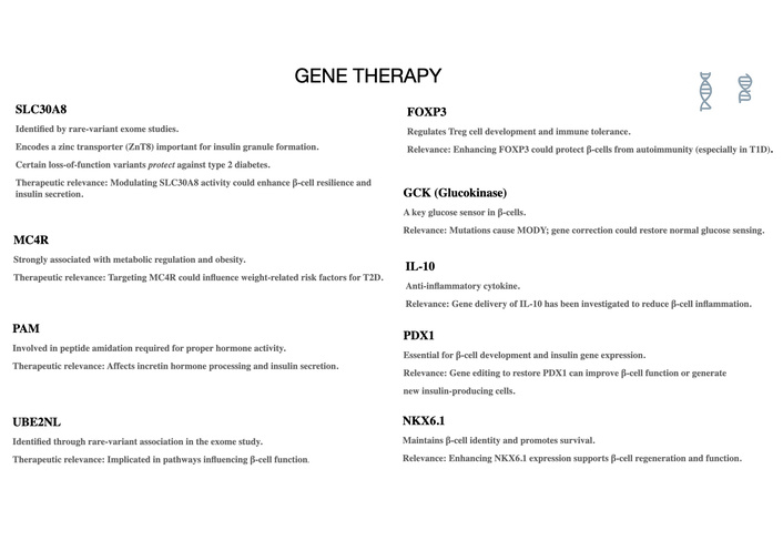 Key gene targets under investigation for gene therapy in diabetes and metabolic dysfunction. Summary of therapeutic gene targets with demonstrated relevance to β-cell function, insulin secretion, immune regulation, and metabolic homeostasis. These include SLC30A8 (zinc transporter ZnT8 involved in insulin granule formation), MC4R (metabolic regulation and obesity), PAM (hormone amidation and incretin processing), UBE2NL (β-cell functional pathways), FOXP3 (T-regulatory cell maintenance and immune tolerance), GCK (glucose sensing and MODY-associated variants), IL-10 (anti-inflammatory modulation), PDX1 (β-cell development and insulin gene expression), and NKX6.1 (β-cell identity and survival). These genes represent high-value candidates for CRISPR-based correction, RNA therapies, or targeted gene modulation. This figure outlines primarily preclinical and early translational concepts, with their relevance to human clinical settings yet to be determined.