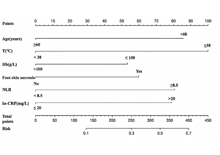 In this study, we performed univariate analysis on significant indicators and combined them based on clinical significance and availability for multivariate stepwise logistic regression to build the NRADNF model. The model includes six conventional indicators: age, body temperature, foot skin necrosis, hemoglobin, NLR, and hs-CRP. While age is generally a risk factor for DF, due to functional decline over time, our logistic regression showed that patients < 60 years were more likely to develop NF. This seemingly contradictory finding may be explained by the fact that NF affects skin and subcutaneous tissue, which is abundant in adipose tissue. Aging is associated with body fat redistribution, characterized by increased truncal fat and decreased subcutaneous fat in the limbs [22], which may be less conducive to the development of NF in the lower extremities of older patients. Pathophysiologically, NF involves the formation of bacterial emboli in local microvessels, blocking blood flow [23], and presents as a necrotic eschar, a key identifying feature [24]. Studies have also linked NF amputation risk to soft tissue and skin necrosis, etc. [25]. Because NF progresses rapidly, systemic manifestations are more pronounced than in simple DF, reflected by significant increases in temperature, white blood cell count, NLR, and hs‑CRP. Hs-CRP is more sensitive than standard CRP and can detect inflammation at lower concentrations [26], making it suitable for early DNF screening. NLR, an emerging inflammatory marker, is widely used in infection, cardiovascular disease, tumors, etc. Neutrophils are the first responders to infection, triggering an inflammatory cascade [27]. Excessive inflammation can deplete lymphocytes, leading to immunosuppression and further inflammatory expansion [28], a conclusion supported by our data. Kim et al. [29] also identified NLR as a classification predictor for DNF in a study of 1,581 DF ulcer patients. Additionally, anemia is a common complication of infection (inflammatory anemia). One study showed that over 20% of sepsis patients had hemoglobin levels < 100 g/L at admission [30].