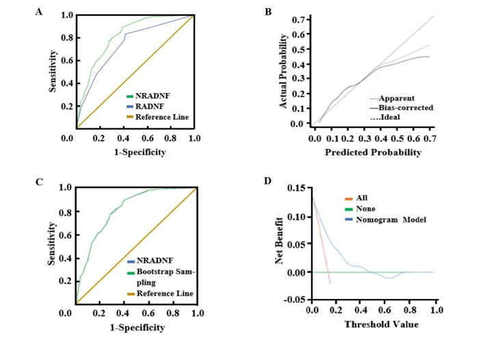 Model accuracy: Calibration curves demonstrated a strong correlation between the predicted results of the NRADNF model and the actual results (Figure 2B); the Hosmer‑Lemeshow goodness-of-fit test confirmed that the prediction model had good accuracy (χ2 = 8.736, P = 0.272).