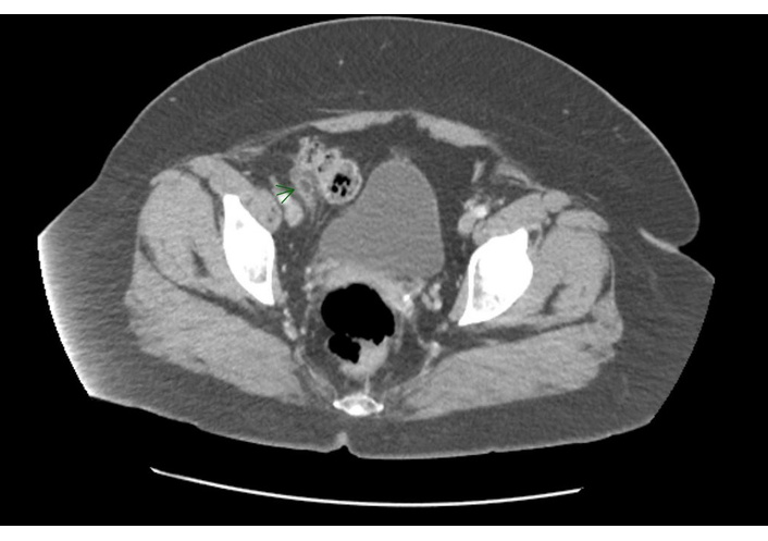 A 45-year-old non-binary Caucasian individual, assigned female at birth, presented to primary care with right lower quadrant abdominal pain. The patient’s gender identity has no known relevance to disease pathophysiology in this case. The individual is referred to hereafter as “the patient”. At the time of encounter, the patient had a past medical history of class II obesity and a body mass index (BMI) of 37.68 kg/m2, prediabetes, hypertension, hypothyroidism, and inflammatory bowel syndrome. The patient’s medication list at the time included tirzepatide 12.5 mg once weekly, metformin extended release (ER) 500 mg two tablets twice daily, amlodipine 5 mg once daily, losartan 100 mg once daily, vortioxetine 20 mg once daily, and levothyroxine 112 μg once daily. The patient also uses a continuous positive airway pressure (CPAP) machine at night.