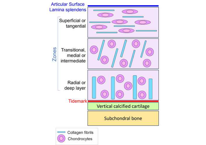 Articular cartilage is a specialized connective tissue, primarily composed of an extracellular matrix (ECM) rich in type II collagen and proteoglycans (glycosaminoglycans), along with smaller amounts of glycoproteins and other non-collagenous proteins [18, 22]. Its only resident cells are chondrocytes, which rely entirely on nutrient diffusion from synovial fluid because the tissue lacks vascular, neural, and lymphatic supply [18, 20, 22–25]. Structurally, cartilage is organized into distinct zones: a superficial layer with flattened chondrocytes and collagen fibrils aligned parallel to the surface; an intermediate zone containing rounder cells and obliquely oriented fibers; and a deep zone characterized by columnar chondrocytes and perpendicular collagen bundles [18, 22, 24–27] (See Figure 1). The tidemark, which is rich in proteoglycans, separates these layers from the underlying calcified cartilage, where hypertrophic chondrocytes anchor the matrix to the subchondral bone [18]. This zonal architecture is critical for distributing load and minimizing friction during joint motion [26]. The ECM is composed predominantly of type II collagen, with type XI collagen contributing to fibrillar organization, while proteoglycans such as aggrecan, hyaluronic acid, and chondroitin sulfate fill the interfibrillar space [22, 28–30]. Together, these components provide the mechanical stability and resilience characteristic of healthy articular cartilage [22, 24, 25, 30].