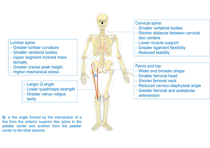 Female anatomical features of the spine, pelvis, quadriceps, and the quadriceps angle (Q angle). The original skeletal image was adapted with permission from https://pixabay.com/vectors/bones-color-anatomy-skeleton-307297/. Accessed January 12, 2026. Licensed under a Pixabay License.