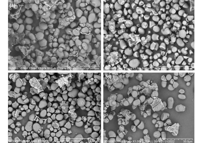 Scanning electron micrographs of Ramón seed starch. (a) Native starch, (b) HMT-modified starch at 10% moisture, (c) HMT-modified starch at 20% moisture, and (d) HMT-modified starch at 30% moisture.