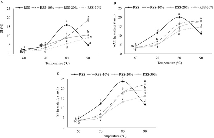 The results of functional properties (SI, WAC, and SP) of native and modified starches are shown in Table 3. The SI in native starches increased with the temperature, except for RSS at 90°C. RSS showed the lowest SI value at 60°C compared to WS and CS. At 70°C, no significant difference was observed; however, at 80°C, RSS had a significant increase over WS (7.8%) and CS (2.3%). At 90°C, while WS continued to increase, CS only had a slight increase, and RSS decreased drastically. The HMT modification of starches particularly favored RSS, which showed increased SI as the temperature increased up to 90°C, particularly in the HMT at 10% moisture from 80°C to 90°C, which was higher than WS and CS. However, at high moisture content (20% and 30%), this property decreased, being similar to CS and lower than WS at the highest temperature. SI in RSS native and modified by HMT is shown in Figure 2A. The HMT impacted RSS, modifying SI and showing a more stable behavior of starch granules as temperature increased.
