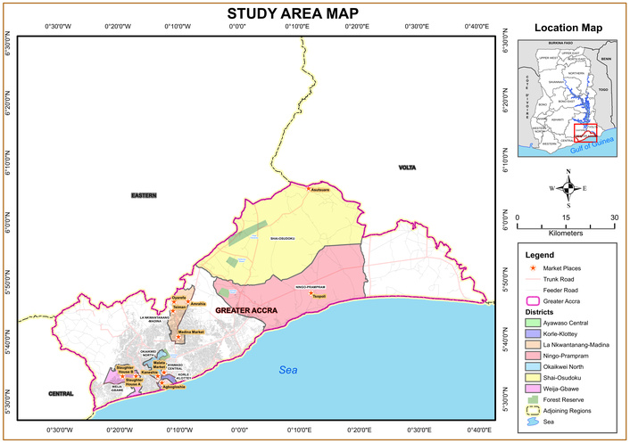 This study was conducted across nine selected markets, 11 livestock farms, and 2 slaughter facilities in six Metropolitan, Municipal and District assemblies (MMDAs) in the Greater Accra Region of Ghana, namely: Accra Metropolitan Assembly (AMA-Kaneshie and Agbogbloshie market), Ayawaso Central Municipal Assembly (Mallam Atta market), Weija/Gbawe Municipal Assembly (Gbawe slaughterhouse), La Nkwantanang Madina Municipal Assembly (LaNMMA), Shai-Osudoku (Asutsuare and Akuse markets), and Ningo-Prampram Districts (Tsopoli and Ningo Ahwiam market) (Figure 1). The Municipal Assemblies were chosen based on the popularity of the market, population density, and foodborne disease outbreak reports where these districts recorded a significant number of cholera and other diarrhoea cases [13].