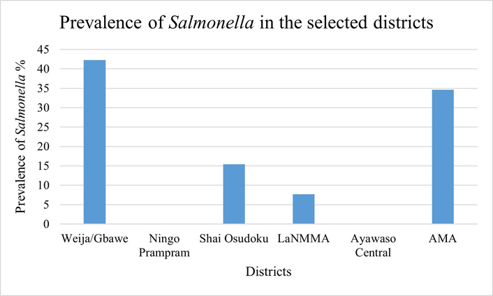Salmonella spp. were isolated from samples from four out of the six districts surveyed in this study. These districts included the LaNMMA, Accra Metropolitan Area, Weija/Gbawe (all more urban), and Shai Osudoku (more rural). The prevalence was 42.3% in Weija/Gbawe, 34.6% in the Accra Metropolitan Area, 15.4% in Shai Osudoku, and 7.7% in LaNMMA (Figure 2). Notably, no Salmonella were isolated from samples collected from the Ayawaso Central (highly urbanized) and Ningo-Prampram (rural district that is undergoing rapid urban expansion).