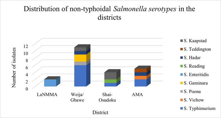 Isolates recovered from samples collected from the Weija/Gbawe district had the highest diversity of five out of the nine serotypes identified: S. Gaminara, S. Typhimurium, S. Hadar, S. Kaapstad, and S. Poona. This was followed by the Accra Metropolitan Area, where four serotypes were detected: S. Typhimurium, S. Virchow, S. Hadar, and S. Teddington (Figure 3). In contrast, samples from LaNMMA had the least diversity, with only one serotype, S. Enteritidis, identified. Of the six districts, these three have the highest population. Notably, S. Typhimurium was the most predominant serotype among isolates from Weija/Gbawe district, accounting for 66.7% of isolates in this district, which houses the largest abattoir exclusively for pigs, from where most of the pork samples were collected.