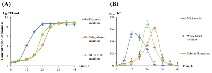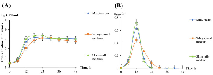 The maximum specific rate of their growth also varied. For B. bifidum, the highest specific growth rate was 0.68 h–1 on Skim milk medium, 0.62 h–1 on Whey-based medium, and 0.57 h–1 on MRS medium, and the time to reach the maximum growth rate was 24, 30, and 12 h, respectively (Figure 1B). For L. plantarum 8P-A3, the maximum growth rate was 0.73, 0.45, and 0.63 h–1 on Skim milk medium, Whey-based medium, and MRS medium, respectively (Figure 2B), and the time to reach the maximum growth rate did not depend on the nutrient medium and was 12 h.