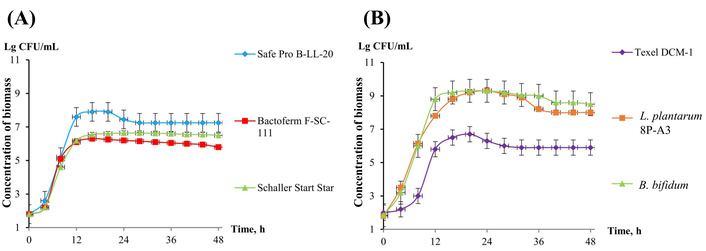 Dynamics of biomass of meat starter and medicinal preparations biomass X, CFU/mL, when cultured in the Whey-based medium. (A) Christian Hansen Safe Pro B-LL-20, Christian Hansen Bactoferm F-SC-111, Schaller Start Star; (B) Texel DCM-1, L. plantarum 8P-A3, B. bifidum. B. bifidum: Bifidobacterium bifidum; L. plantarum: Lactiplantibacillus plantarum.