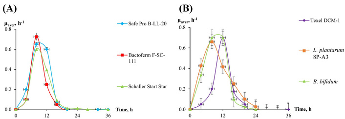 Average specific growth rates µ, h–1, of meat starters and medicinal preparations biomass in the Whey-based medium. (A) Christian Hansen Safe Pro B-LL-20, Christian Hansen Bactoferm F-SC-111, Schaller Start Star; (B) Texel DCM-1, L. plantarum 8P-A3, B. bifidum. B. bifidum: Bifidobacterium bifidum; L. plantarum: Lactiplantibacillus plantarum.